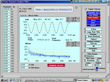 PHA-1 is a software module that can be added to the PQA-1 module. It is designed to provide most comprehensive harmonic analysis for the electric power networks. The PHA-1 can either be used as a stand-alone instrument (in conjunction with the hardware module) or it can be purchased as an add-on option to complement the Power Quality Analyser PQA-1, for more detailed harmonic distortion-related studies. When in operation the PHA continuously acquires and processes a selected voltage or current input channel. A high degree of accuracy in the analyses is achieved through the implementation of modern, state of the art digital signal processing methods. A dynamic numeric table (as can be seen on the right hand side of the screen snapshot) displays RMS values of harmonics from the fundamental through to 50th harmonic. Using one of four selectable logging rates, the analyser stores 58 wave parameters on the hard disk of the host notebook computer along with the date and time-stamps in CSV. comma delimited format.